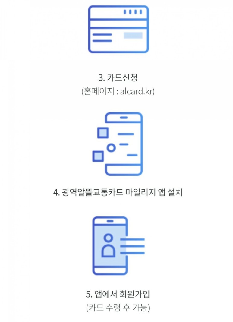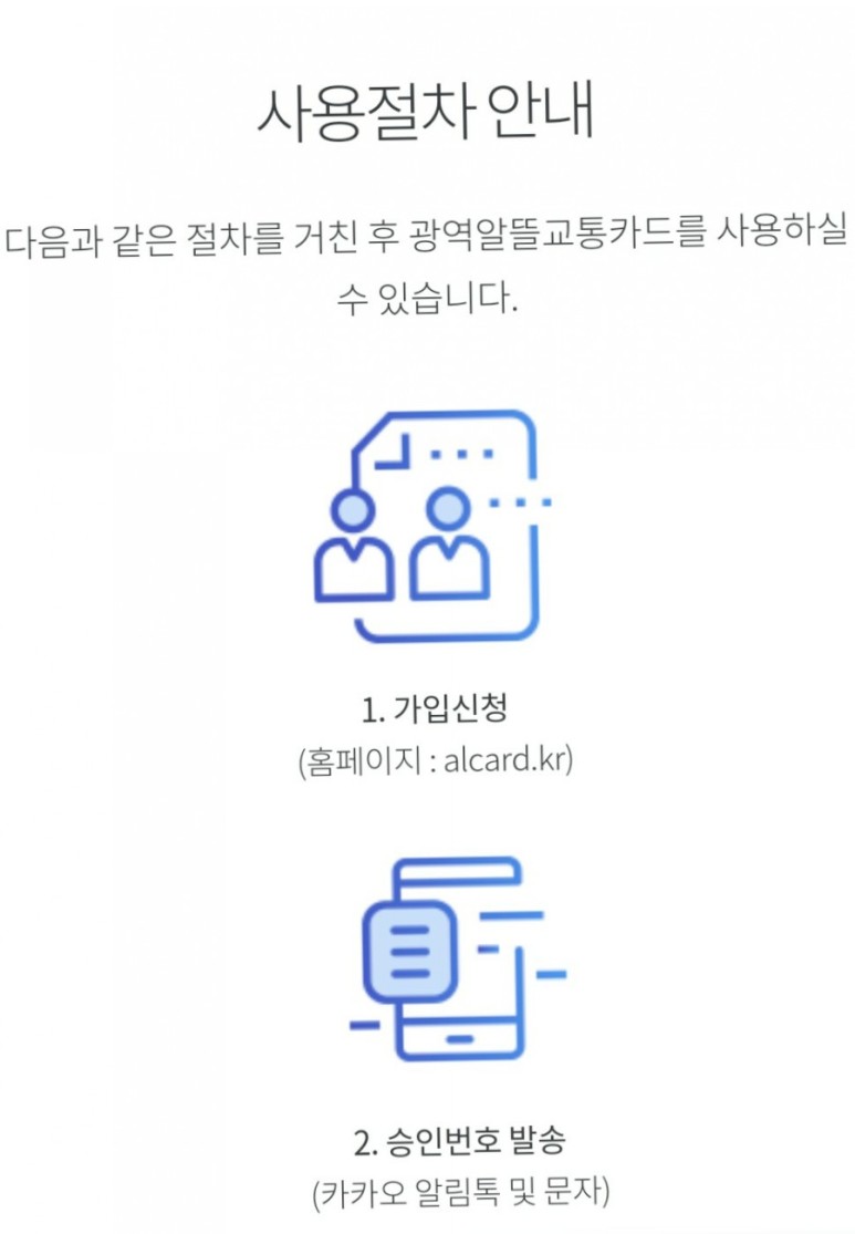 가입신청->승인번호 발송 ->카드신청->광역알뜰교통카드 마일리지 앱 설치->앱에서 회원가입