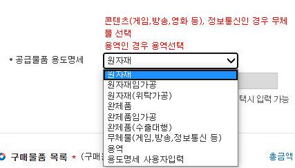 공급물품 용도명세: 구입한 물품의 성격에 맞게 선택