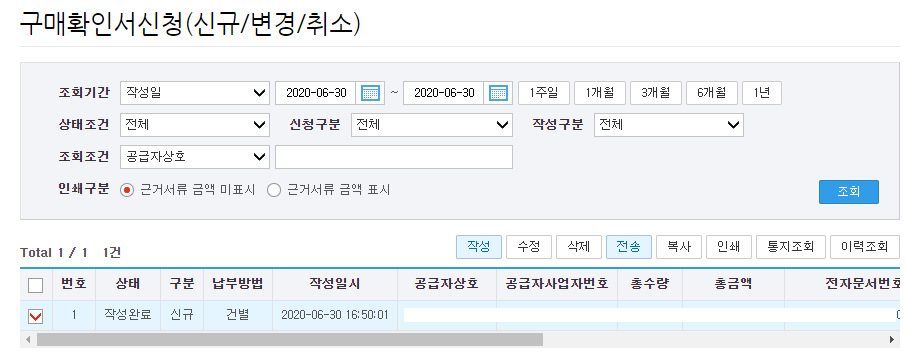 왼쪽 하단에 V 표시 체크를 하고 전송을 누르면 발행 완료입니다