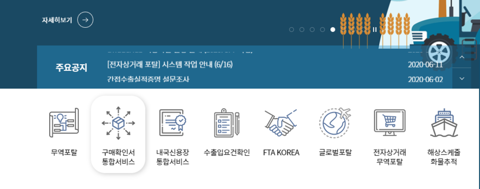 클릭하면 무역포탈/구매확인서 통합정보서비스 두 선택지가 두가지가 나오는 데,