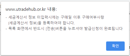 모든 정보를 입력 한 뒤 저장을 누르면 아래와 같은 경고창이 뜨는 데(세금계산서 미입력시) 확인을 눌러줍니다.